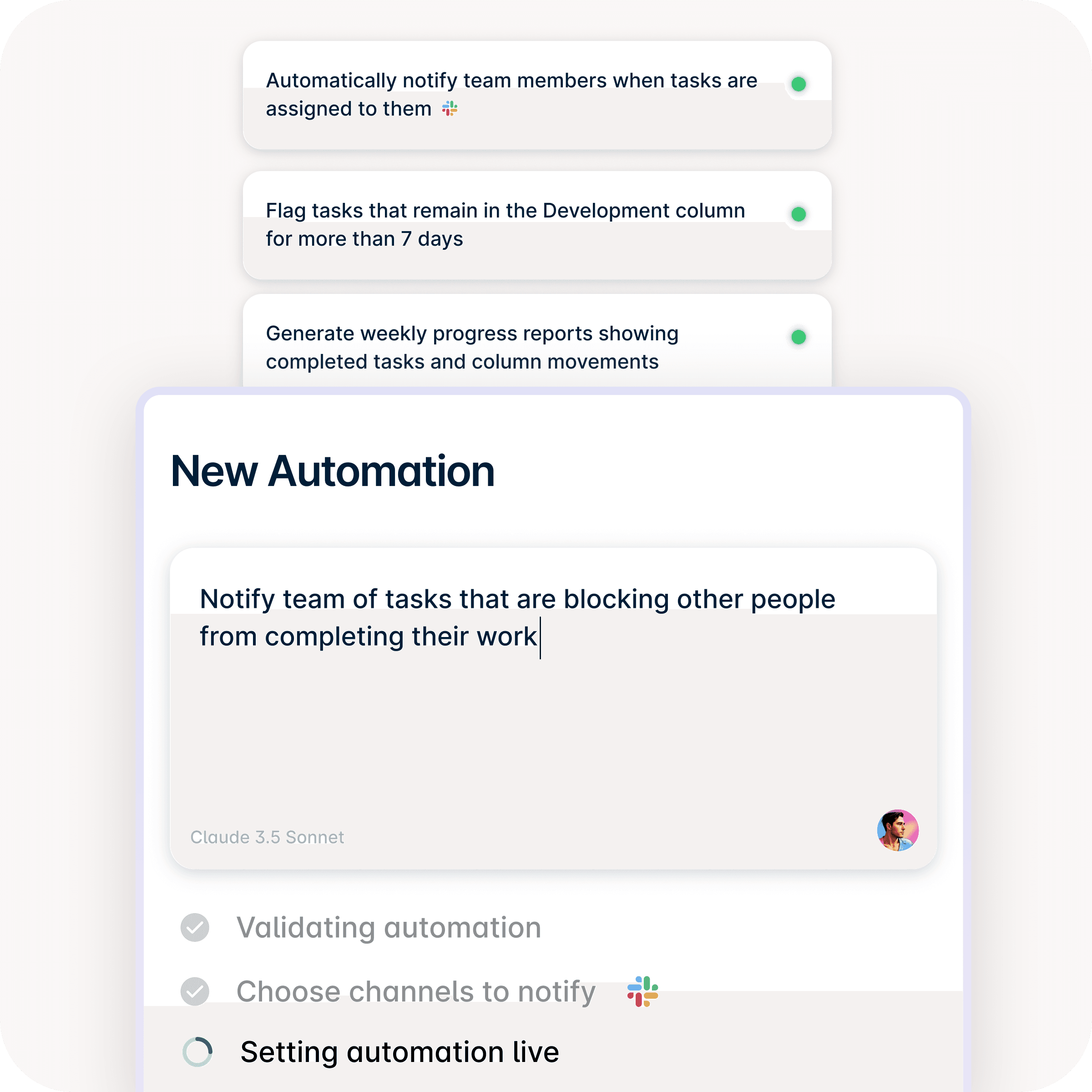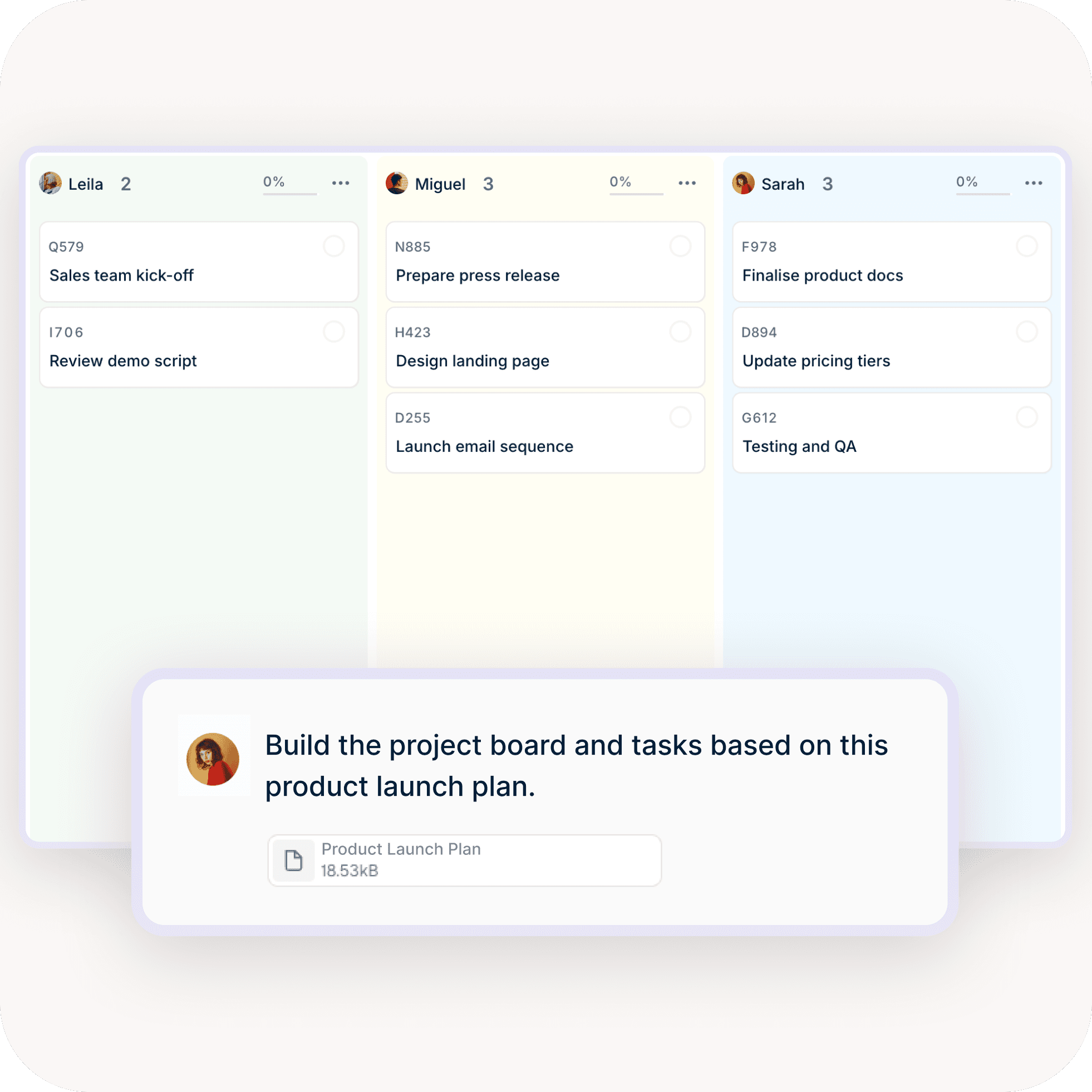 Generate new boards from a prompt, with columns, stages with no manual configuration needed.
